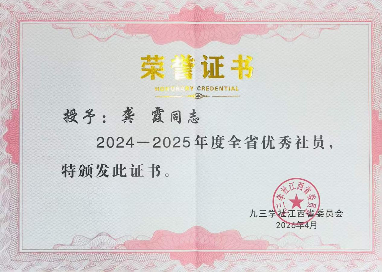 2026年4月1日,九三学社江西省委员会下发《关于表彰2024-2025年度全省优秀社员和社务工作者的决定》,表彰了150名先进个人,我院龚霞教授荣获“全省优秀社员”称号,这是对其立足岗位建功立业,履职尽责担当作为的认可和鼓励,也是对我院统战工作和人才队伍建设成效的肯定。