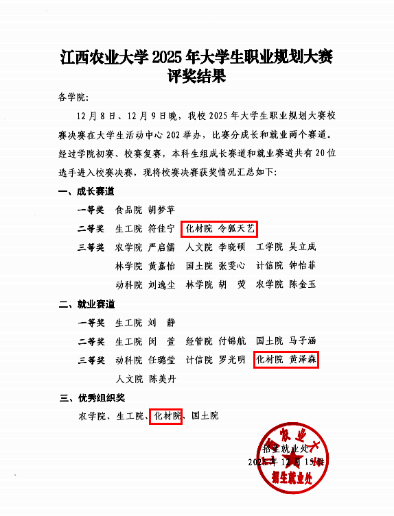 12月8日至9日,学校大学生职业规划大赛落下帷幕。经过激烈角逐,我院材料2302班令狐天艺同学荣获成长赛道二等奖,黄泽森同学荣获就业赛道三等奖,学院荣获大赛优秀组织奖。