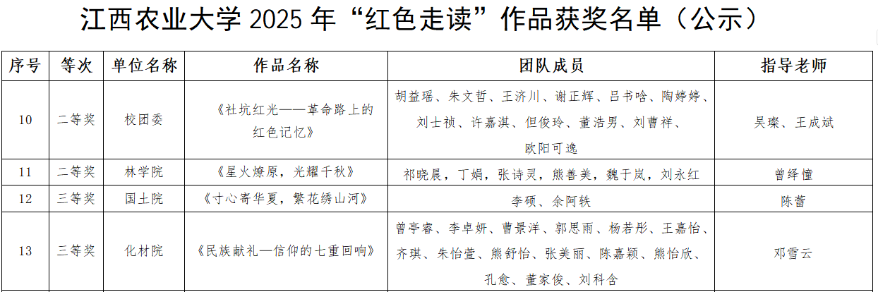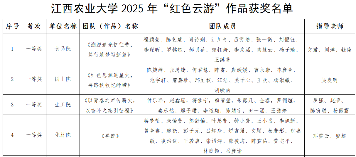 2025年12月10日,江西农业大学2025年“红色走读”活动评选结果正式揭晓,我院学子深耕红色文化、聚力创作实践,在众多参赛作品中脱颖而出、斩获佳绩。经过严格评审,我院作品《寻迹》荣获“红色云游”作品一等奖;《民族献礼—信仰的七重回响》荣获“红色走读”作品三等奖。