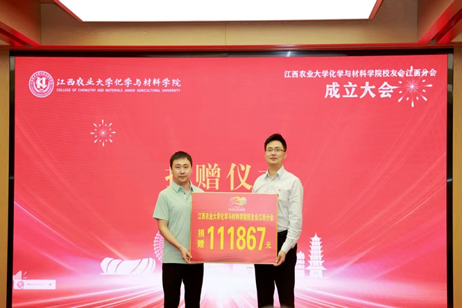 胡凯龙在会上作表态发言并代表江西分会向学校捐赠。国土资源与环境学院与化学与材料学院校友会负责人分别致贺词,对化学与材料学院校友会江西分会的成立表示热烈的祝贺。