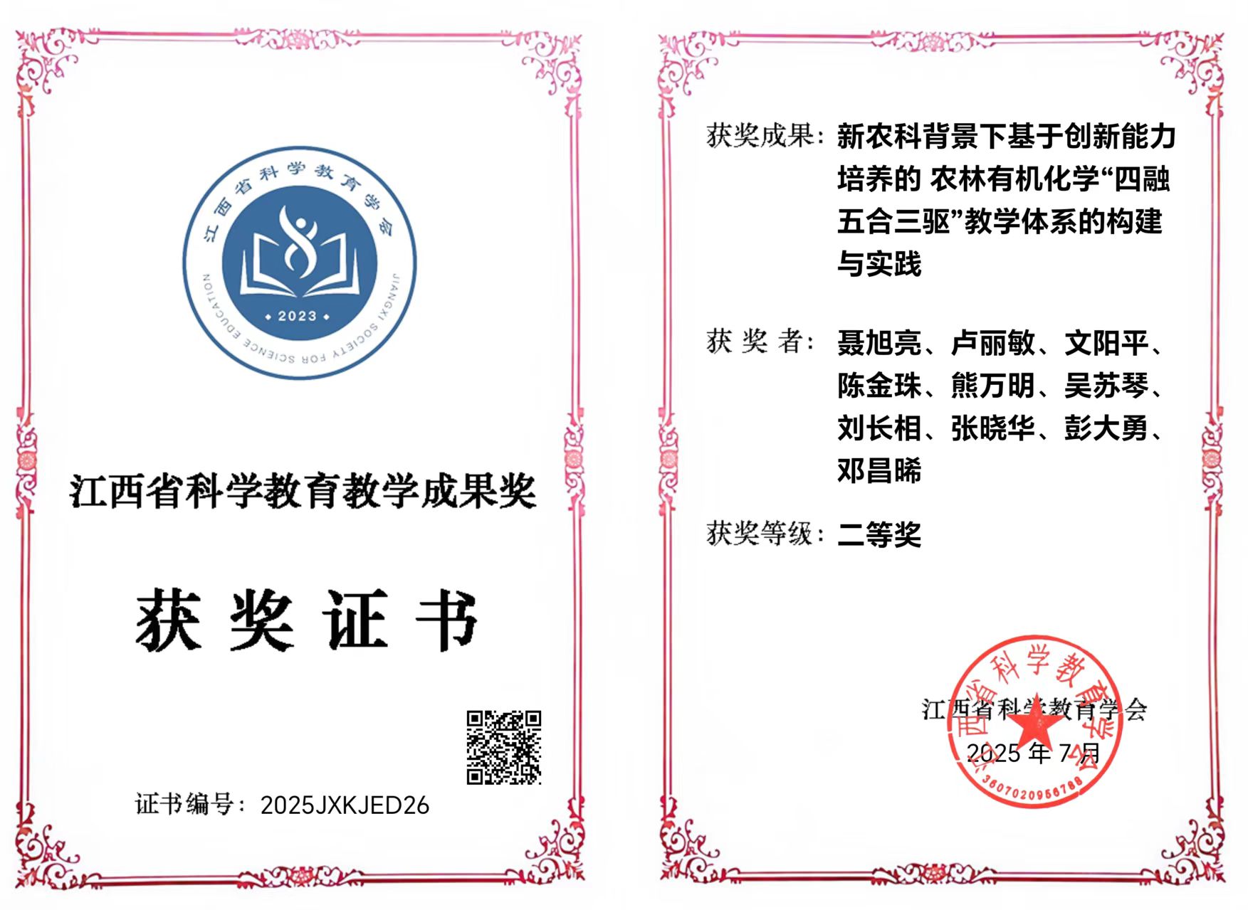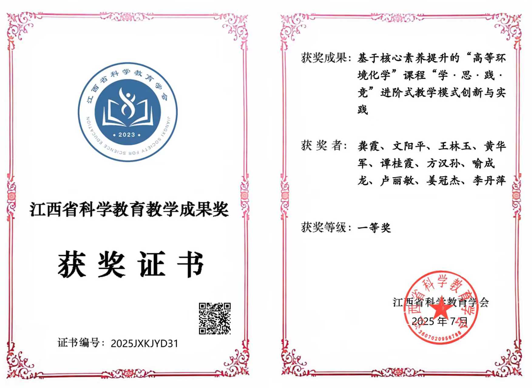 另外,我院3项教学成果获得江西省科学教育学会教学成果奖。其中,龚霞、聂旭亮、刘倩等的教学成果“融合·递进·立体·多元:基础化学课程群育人的江农模式”荣获特等奖,龚霞、文阳平、王林玉等的教学成果“基于核心素养提升的‘高等环境化学’课程‘学·思·践·竞’进阶式教学模式创新与实践”荣获一等奖,聂旭亮、卢丽敏、文阳平等的教学成果“新农科背景下基于创新能力培养的农林有机化学‘四融五合三驱’教学体系的构建与实践”荣获二等奖。