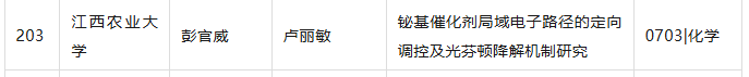 近日,江西省人民政府学位委员会办公室发布了《关于2025年江西省优秀博士硕士学位论文评审结果的公示》,我院2021级化学专业硕士研究生彭官威(导师:卢丽敏)的学位论文《铋基催化剂局域电子路径的定向调控及光芬顿降解机制研究》获评2025年江西省优秀硕士学位论文。