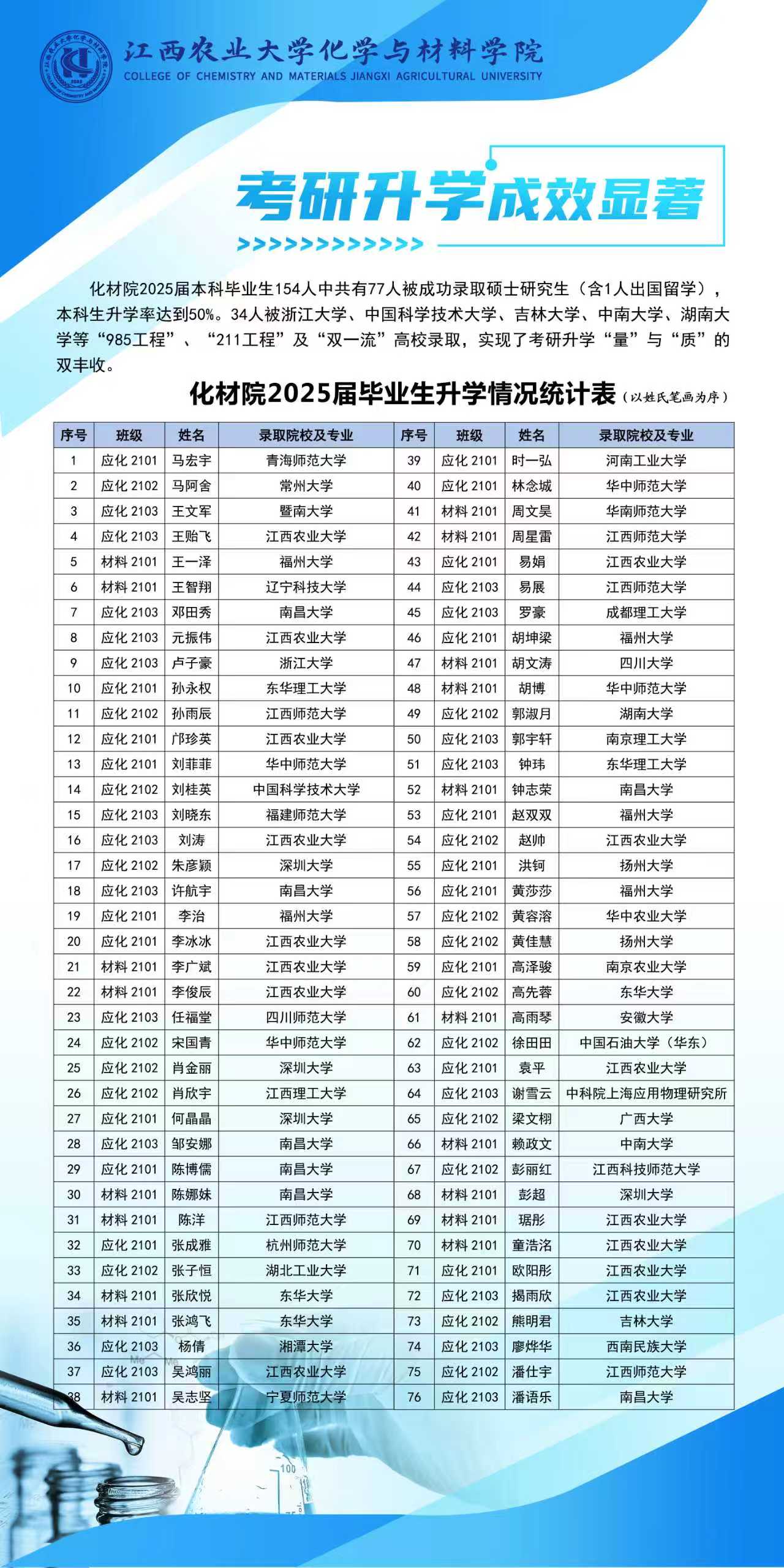 2025年5月,随着研究生录取工作落下帷幕,学院2025届本科毕业生154人中共有77人被成功录取(含1人出国留学),本科生升学率达到50%,较2024年提升10.39%,首次位列全校第一。34人被浙江大学、中国科学技术大学、吉林大学、中南大学、湖南大学等“985工程”、“211工程”及“双一流”高校录取,实现了考研升学“量”与“质”的双丰收。