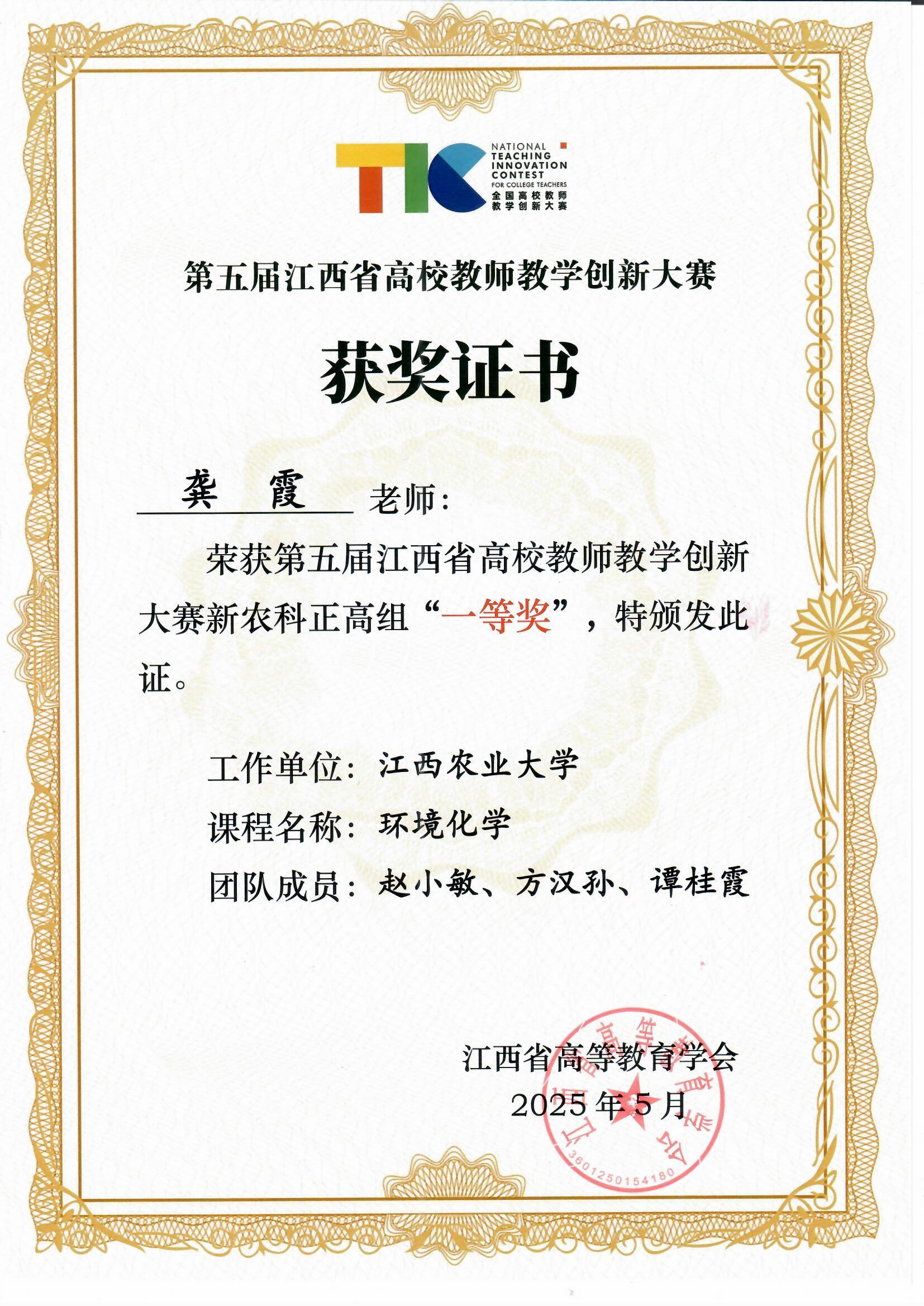 2025年5月,江西省第五届高校教师教学创新大赛结果揭晓,我院龚霞教授“环境化学”教学团队荣获新农科正高组一等奖。