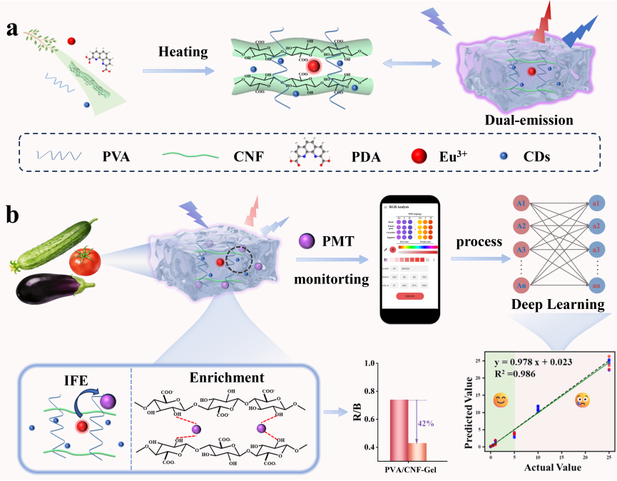 针对传统农药残留检测方法难以实现活体作物实时、原位监测的瓶颈,该论文提出了一种基于聚乙烯醇/纤维素纳米纤维复合网络的双发射比率荧光水凝胶传感器,用于嘧霉胺的高灵敏度、高保真原位检测。传感设计中,利用纤维素纳米纤维的主动富集作用可将检测信号提升约2倍。同时,通过Eu-MOF与碳点的双发射自校准机制有效消除环境干扰,并结合智能手机成像与反向传播人工神经网络实现高保真定量分析。该水凝胶传感贴片可灵活实现与番茄、黄瓜、茄子等多种农产品表面的共形贴附,完成嘧霉胺残留的快速原位检测,其检测限低至33.46 μg/kg,加标回收率范围为94.0%~104.7%。