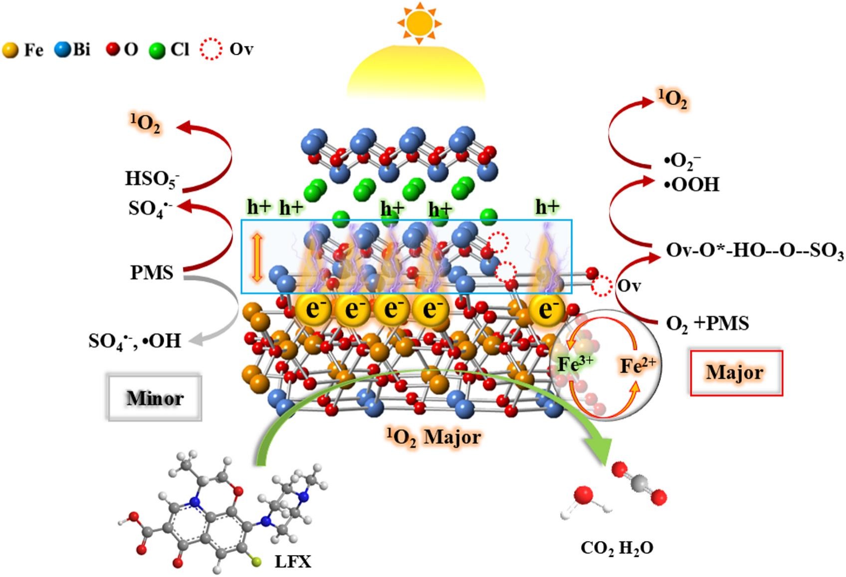 单线态氧(1O2)被认为是降解富电子抗生素污染物的亲电活性物种。然而,选择性生成1O2仍然是一个巨大的挑战。本文采用盐酸刻蚀结合原位溶剂热法制备了氧空位辅助的Bi2Fe4O9/BiOCl同源异质结光催化过氧单硫酸盐(PMS),并通过对PMS的结构调控实现了单线态氧(1O2)的产生,从而实现了富电子左氧氟沙星的高效降解。原位拉曼光谱和实验结果表明,在该体系中,氧空位可以有效地吸附和桥接PMS,而异质结结构可以加速电子转移到连续的Fe2+再生,从而促进PMS的利用。Bi2Fe4O9/BiOCl的同源结构提供了Bi-Ov-Fe位,缩短了活性物种的迁移距离。因此,氧空位占主导地位的光催化剂转化溶解氧生成Ov-O* 和Ov-O*-PMS中间体。电子顺磁共振(EPR)和自由基捕获实验表明,Fe位上的电子与附近的Ov相互作用,削弱了PMS的O-O键,生成·OOH、·O2-和1O2,从而有效地生成1O2。结果表明,优化的Ov-BFO/BOC-2催化剂在30 min内的降解效率达到95.8%,相应的动力学常数分别是纯Bi2Fe4O9和BiOCl的5.1倍和33.36倍。利用HPLC-MS分析了LFX降解的可能途径,并利用ECOSAR软件对LFX的毒性演化进行了评价。该研究阐明了表面Ov-O*-PMS中间体在1O2形成机理中的重要性,为缺陷控制工程提供了新的思路。