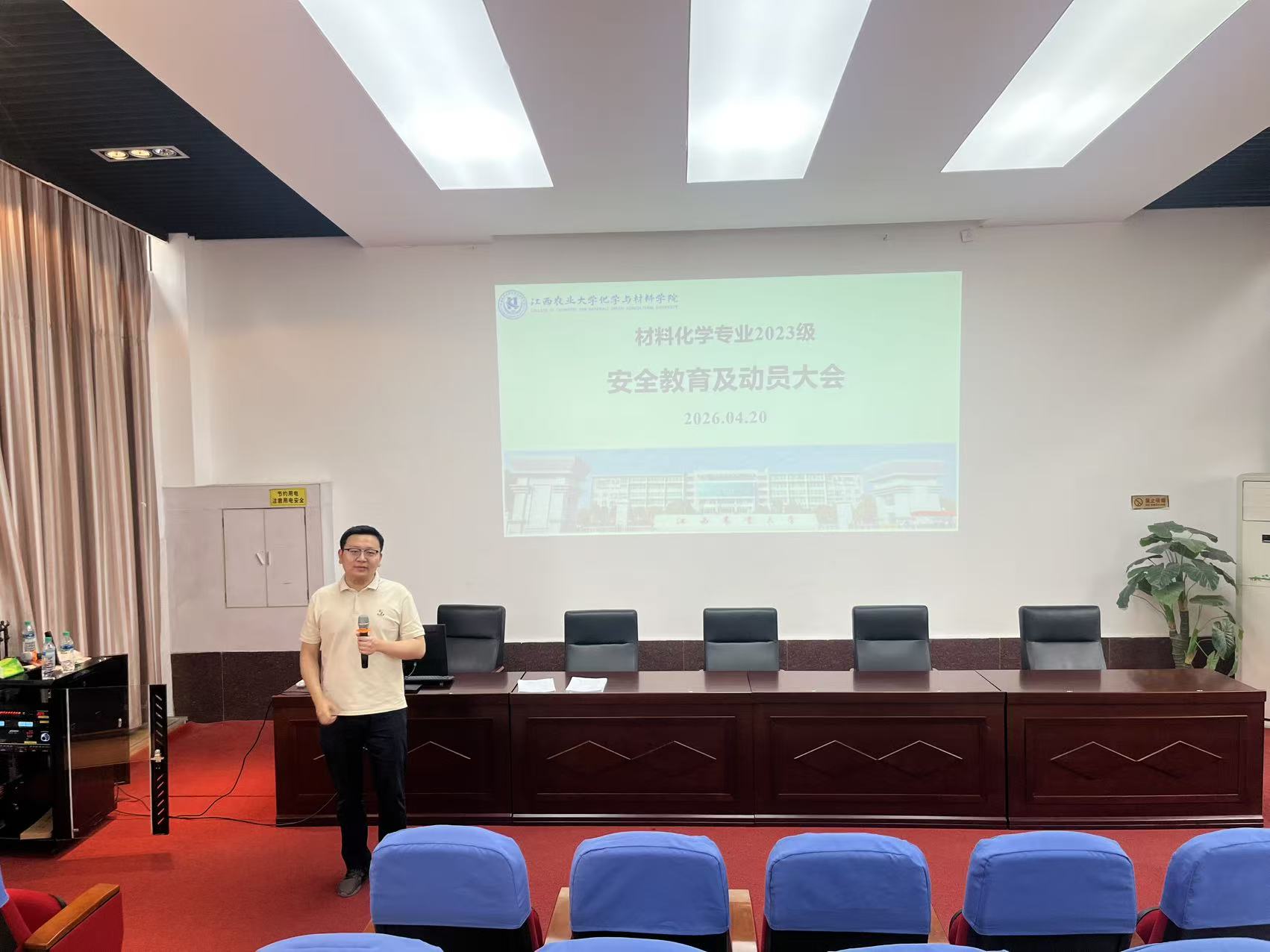 为切实保障材料化学专业科研基础训练实习安全、有序开展,我院于2026年4月20日下午在学院一楼阶梯教室召开实习安全教育暨动员大会,为即将奔赴实习岗位的同学们筑牢安全思想防线,激发实践学习热情。本次大会由胡嘉麒老师主持,2023级材料化学专业全体实习学生参加。