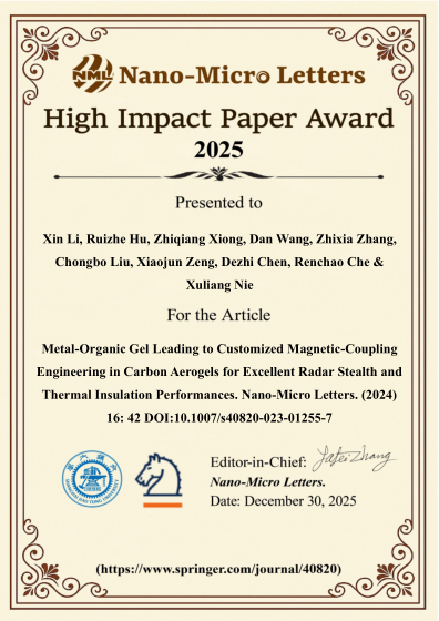 我院教师聂旭亮作为共同通讯作者2024年在《Nano-Micro Letters》发表的论文《Metal–Organic Gel Leading to Customized MagneticCoupling Engineering in Carbon Aerogels for Excellent Radar Stealth and Thermal Insulation Performances》荣获2025年度“High Cited Paper Award”(见证书)。该论文合成了两种具有优异的雷达隐身性能和隔热性能的气凝胶。